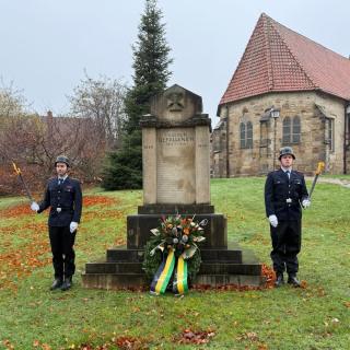 Im Beisein von Feuerwehrmitgliedern, dem Musikzug und Vertreterinnen und Vertretern der Politik wurde der Opfer von Krieg, Gewalt und Verfolgung gedacht.