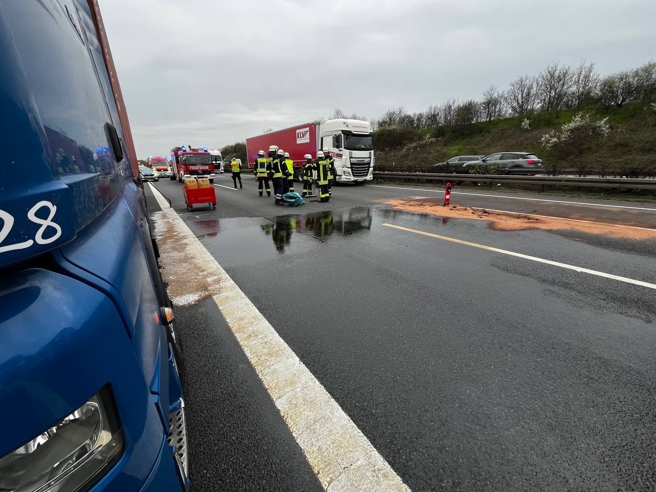 Während der Arbeiten wurde die Einsatzstelle abgesichert, der Brandschutz sichergestellt und die Autobahn zeitweise gesperrt. Außerdem wurden die untere Wasserbehörde sowie die Autobahnmeisterei zur Beurteilung und Beseitigung der entstandenen Verunreinigung nachgefordert. Die Bergung des LKW dauerte nach Einsatzende der Feuerwehr noch längere Zeit an und sorgte im Verlauf des Nachmittags für eine Überlastung der Ausweichstrecken. (axs)